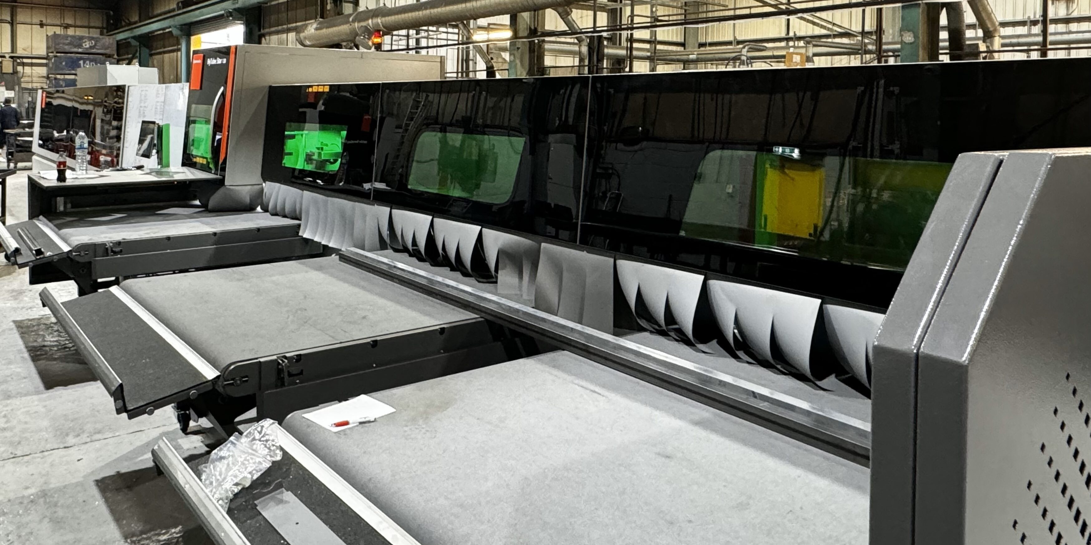 The machine has a 4kW laser, an 8.5 meter loading system, and a 6 meter unloading system.